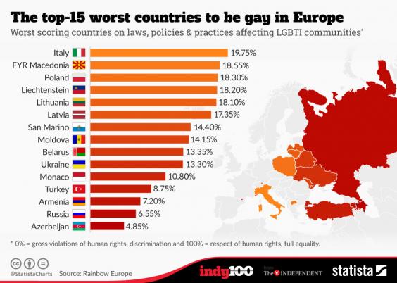Indeksi i organizatës evropiane ILGA-Europe Rainbow radhit 49 shtete evropiane bazuar në ligjet, politikat dhe praktikat që ndikojnë në jetën e komunitetit LGBT.