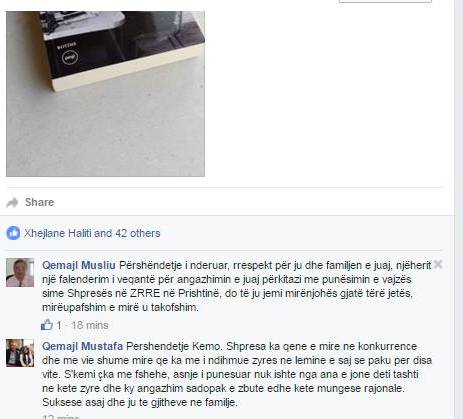 “Përshëndetje Kemo. Shpresa ka qenë e mirë në konkurrencë dhe me vjen shumë e mirë qe ka me i ndihmue zyrës në lëminë e saj së paku për disa vite. S’kemi çka me fsheh, asnjë i punësuar nuk ishte nga ana e jone deri tash në këtë zyrë dhe ky angazhim sadopak e zbute edhe këtë mungese rajonale. Suksese asaj dhe ju të gjithëve ne familje”, i ka shkruar Mustafa.