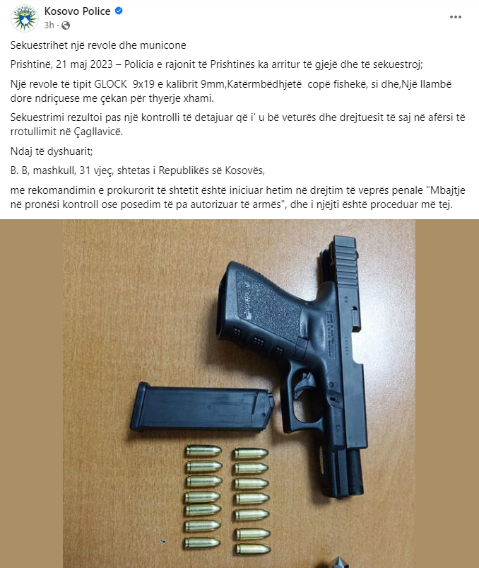 31 vjeçari me rekomandimin e prokurorit të shtetit është iniciuar hetim në drejtim të veprës penale “Mbajtje në pronësi kontroll ose posedim të pa autorizuar të armës”, dhe i njëjti është proceduar më tej.