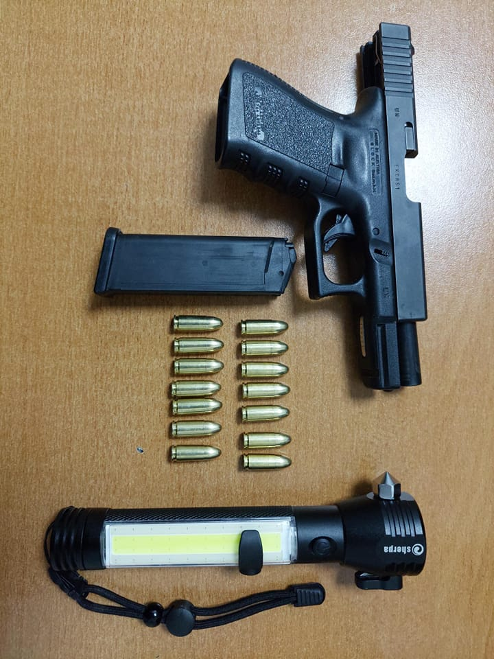 Policia ka njoftuar se të dyshuarit B.B i janë sekuestruar një revlole, 14 fishekë, një llambë dore dhe një çekan për thyerje xhami.