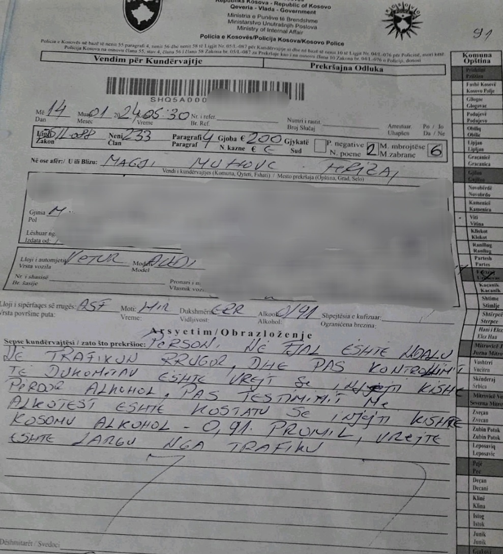 “Policia e Njësisë së Komunikacionit Rrugor me datën 14.01.2024, rreth orës 05:30 në rrugën magjistrale Ferizaj -Prishtinë, në fshatin Muhovc të Ferizajt, ka ndaluar shoferin M.M (M/K) i moshës 39 vjeçar, i cili ka drejtuar veturën nën ndikimin e alkoolit, ku pas testimit me alkool-test ka rezultuar 0.91 promila dhe për këtë policia i shqiptoi gjobën prej 200 euro, 2 pikë negative dhe 6 muaj masë mbrojtëse, heqje e patentë shoferit”, thuhet në komunikatën e policisë.