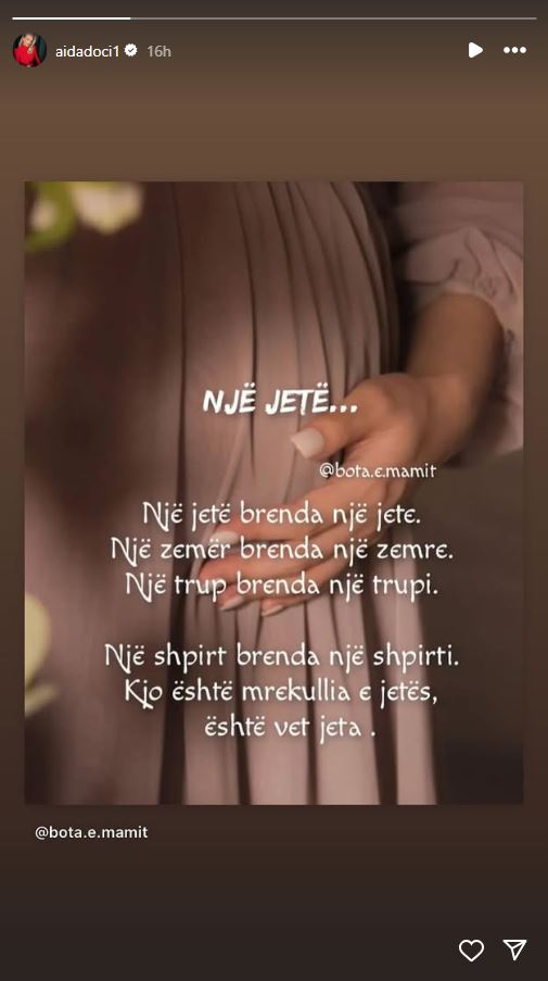 “Një jetë brenda një jete. Një zemër brenda një zemre. Një trup brenda një trupi. Një shpirt brenda një shpirti. Kjo është mrekullia e jetës, është vet jeta”, është thënia që ka shpërndarë Aida bashkë me një foto me barkun e fryer.