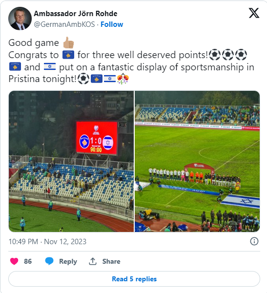 “Urime Kosovës për tri pikët e merituara. Kosova dhe Izraeli bënë një shfaqje fantastike të lojës fer sonte në Prishtinë”, është ky komenti i ambasadorit.