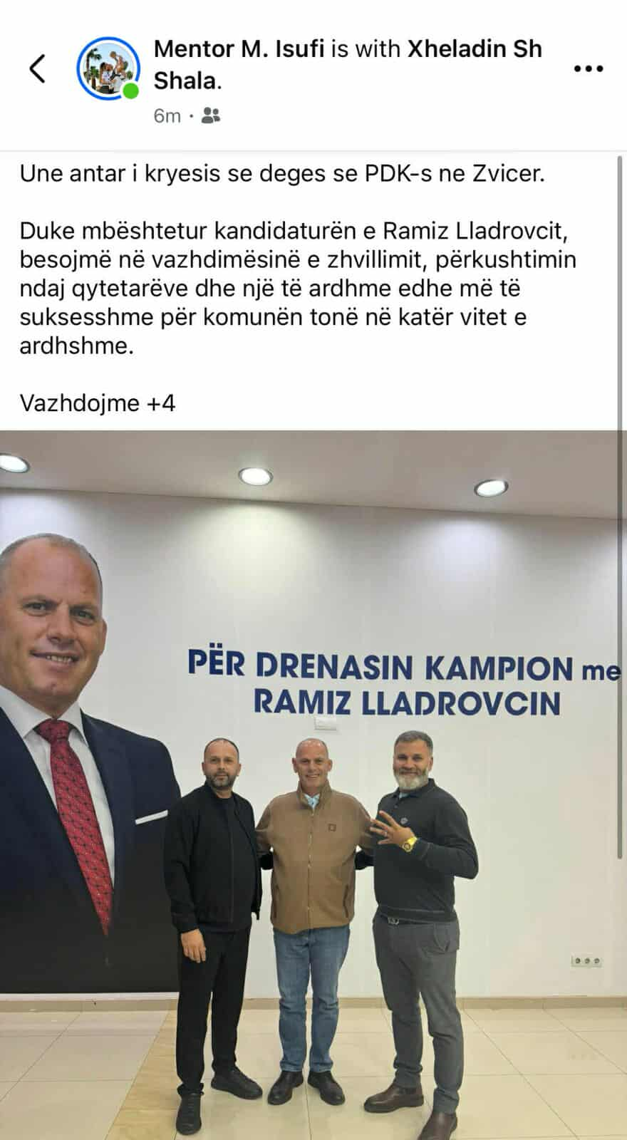 “Unë anëtar i kryesis së PDK-së së degës së PDK-së në Zvicër, duke mbështetur kandidaturën e Ramiz Lladrovcit, besojmë në vazhdimësinë e zhvillimit, përkushtimin ndaj qytetarëve dhe një të ardhme edhe më të suksesshme për komunën tonë për katër vitet e ardhshme. Vazhdojme +4”, ka shkruar ai.