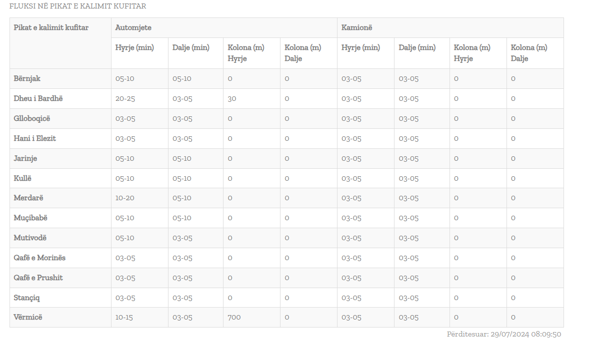 Ndërsa, te pika kufitare Kullë pritjet për të hyrë në Kosovë janë 10 deri në 20 minuta, po ashtu pritje deri në 15 minuta ka edhe në dalje.