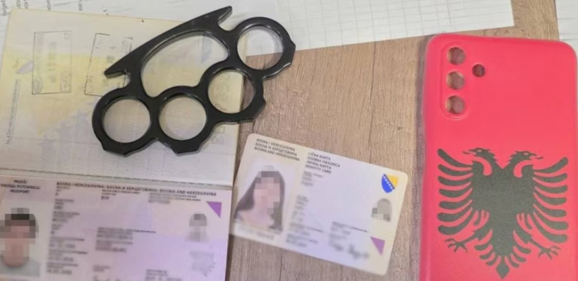 Sipas njoftimit, te M.S. u gjetën një boks metalik dhe një mbulesë telefoni me simbolet e flamurit shqiptar.