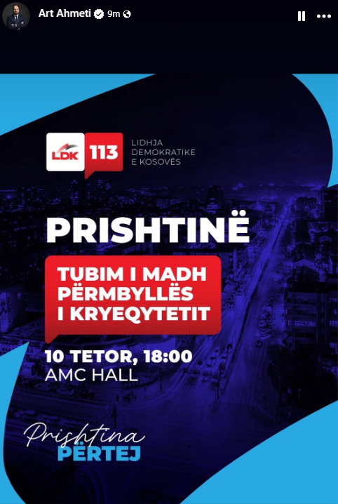 Ahmeti, i cili në këto zgjedhje garon me numrin 44, ka ftuar qytetarët e Prishtinës të marrin pjesë në tubimin përmbyllës të LDK-së që do të mbahet më 10 tetor, ora 18:00, në AMC Hall.
