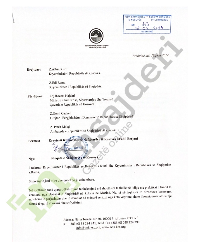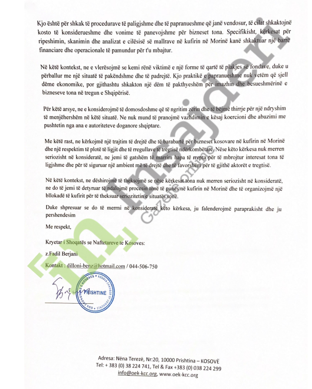 Kryetari i Shoqatës së Naftëtarëve, Fadil Berjani i është drejtuar me një shkresë kryeministrit të Kosovës, Albin Kurti atij të Shqipërisë, Edi Rama për trajtim jo të denjë nga Dogana e Shqipërisë në kufirin në Morinë.