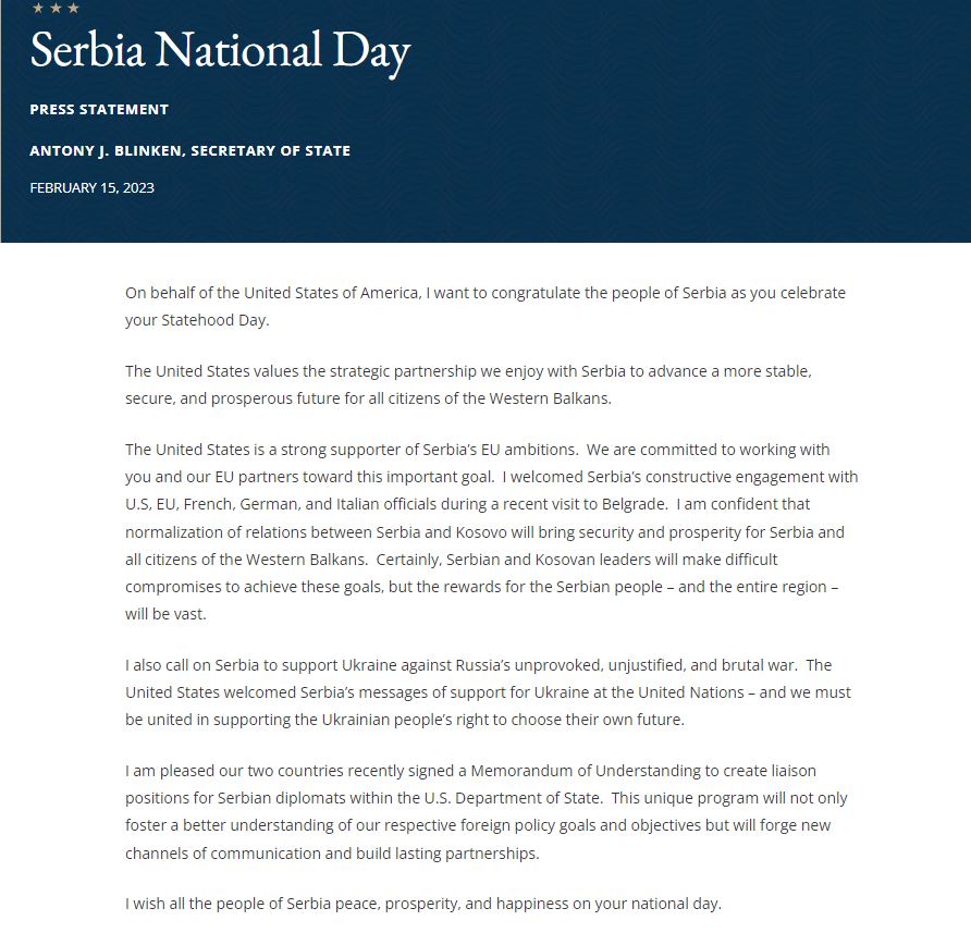 Sekretari amerikan i Shtetit, Anthony Blinken, i është drejtuar me letër uruese Presidentit të Serbisë, Aleksandar Vuçiq, në rastin e Ditës së Shtetësisë së Serbisë, ku mes tjerash e ka falënderuar “për angazhim konstruktiv” në vizitën e pesë diplomatëve nga ShBA dhe BE, takim ky që përfundoi me pranimin e planit amerikano-evropian për normalizimin e marrëdhënieve Kosovë-Serbi, shkruan Insajderi.