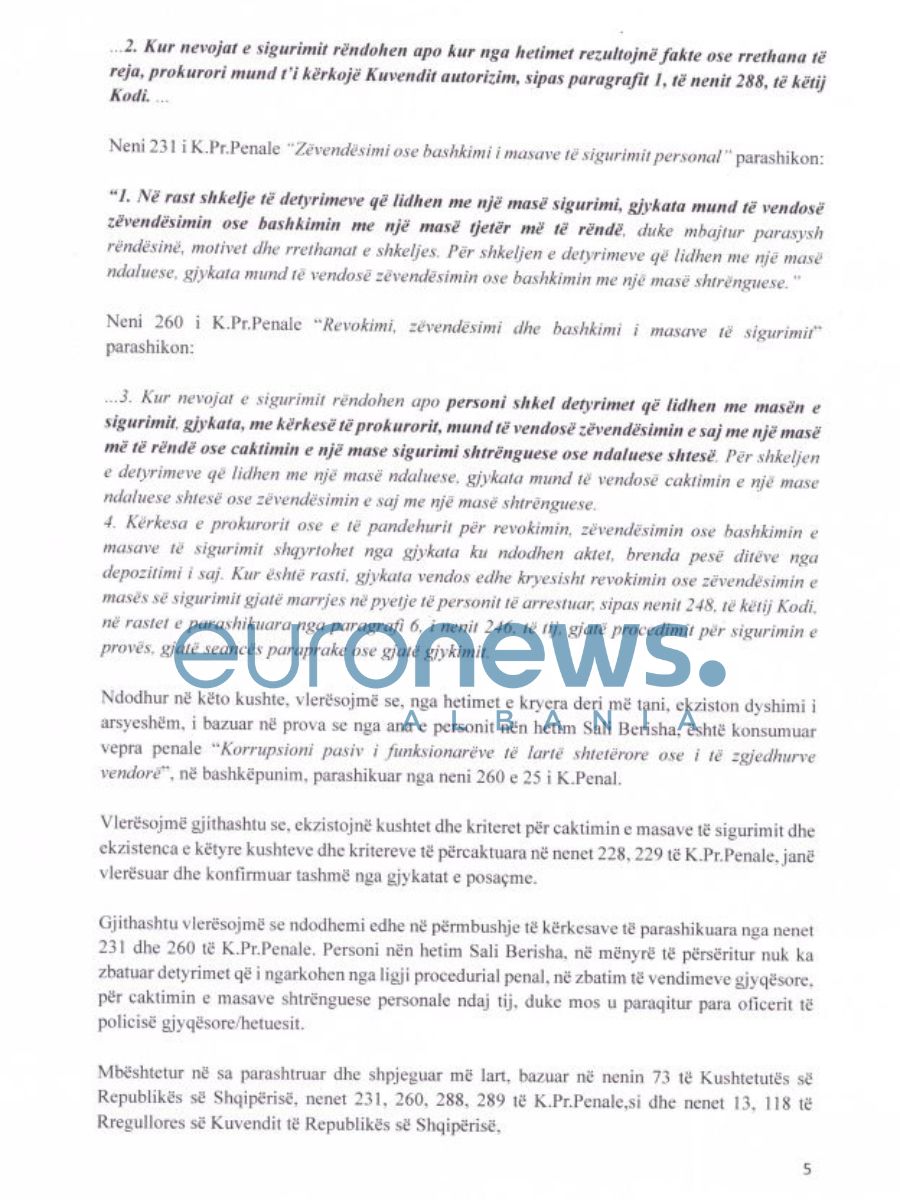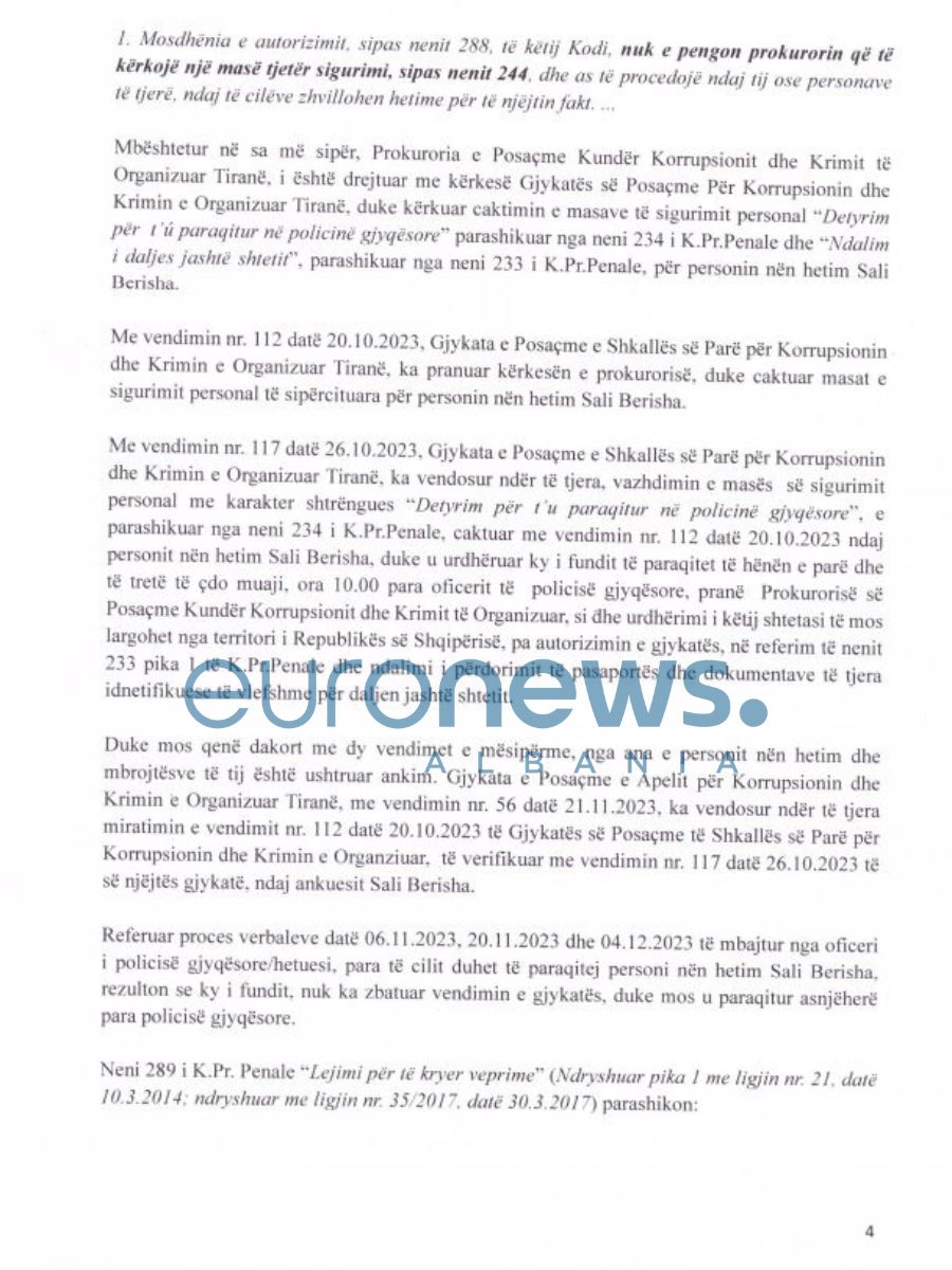 Ekzistenca e këtyre kushteve dhe kritereve të përcaktuara në nenet 228, 229 të K.Pr.Penale, janë 231 dhe 260 të K.Pr.Penale. Personi nën hetim Sali Berisha, në mënyrë të përsëritur nuk ka zbatuar detyrimet që i ngarkohen nga ligji procedurial penal, në zbatim të vendimeve giygësore, për caktimin e masave shtrënguese personale ndaj tij, duke mos u paragitur para oficerit të policisëgjyqësore/hetuesit.