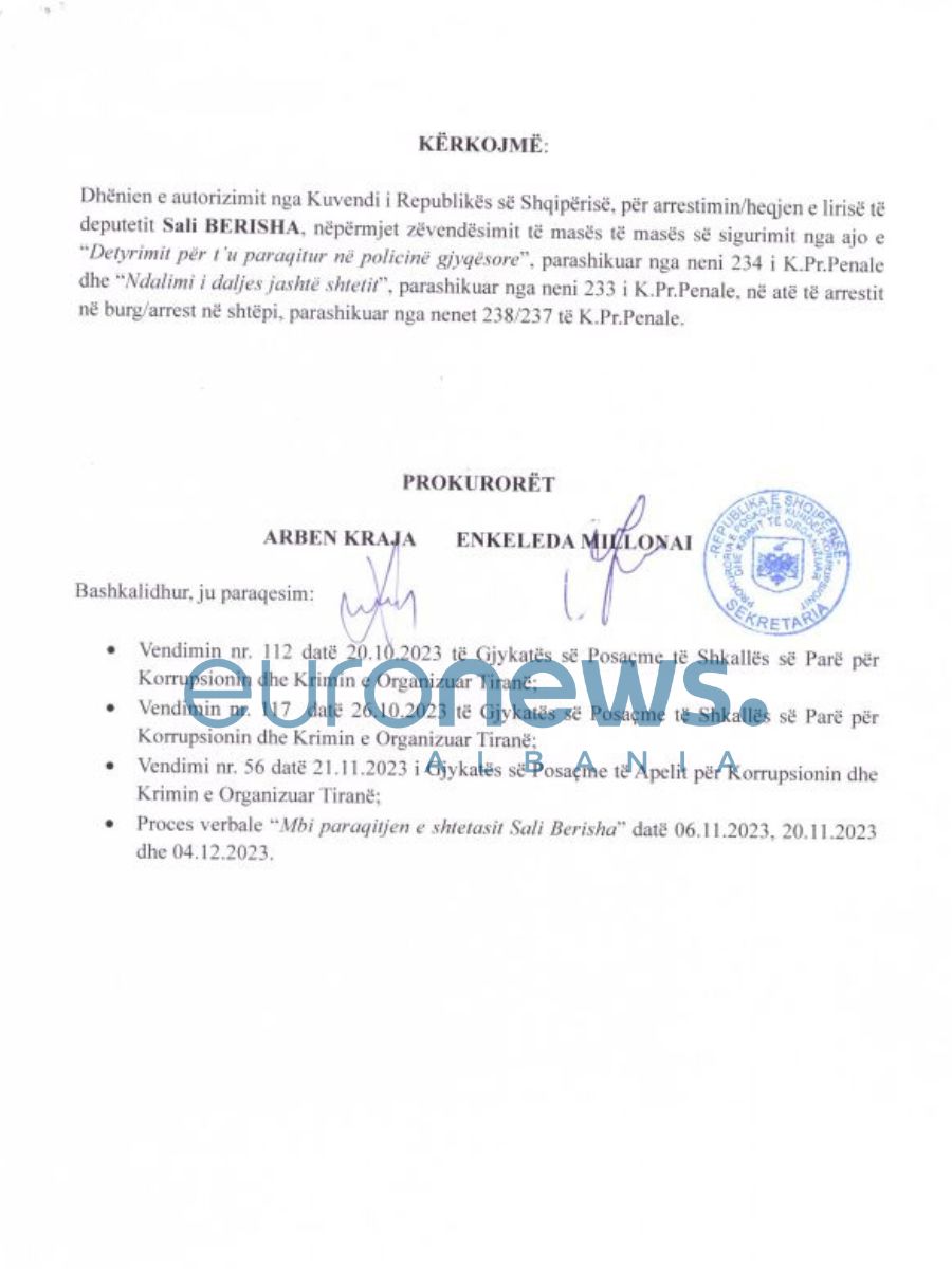 Dhënien e autorizimit nga Kuvendi i Republikës së Shqipërisë, për arrestimin/heqjen e lirisë të deputetit Sali BERISHA, nëpërmjet zëvendësimit të masës të masës së sigurimit nga ajo e “Detyrimit për t’u paraqitur në policinë gjyqësore”, parashikuar nga neni 234 i K.Pr.Penale dhe “*Ndalimi i daljes jashtë shtetit”, parashikuar nga neni 233 i K.Pr.Penale, në atë të arrestit në burg/arrest në shtëpi, parashikuar nga nenet 238/237 të K.Pr.Penale.