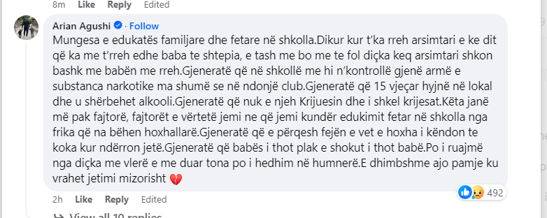 Tutje, në një reagim që ka bërë përmes një komenti në Facebook, reperi kritikon edukimin e gjeneratave të reja. Agushi ka folur për disa dukuri negative që janë në rritje tek të rinjtë nëpër shkolla, siç janë përdorimi i substancave narkotike e posedimi i armëve.