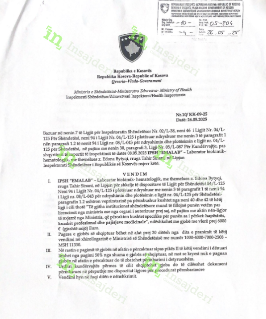 Laboratori biokimik-hematologjik “Emalab”, në pronësi të Edona Bytyqit, është ndëshkuar me një gjobë prej 6 mijë eurosh nga Inspektorati Shëndetësor, pas konstatimit të shkeljeve të rënda në mënyrën e lëshimit të analizave.