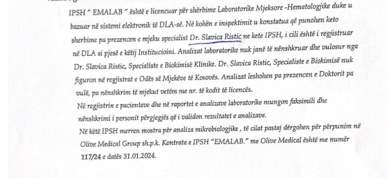 Në muajin maj të këtij viti, Inspektorati Shëndetësor ka kryer një inspektim në këtë laborator dhe ka konstatuar se analizat përpunohen dhe lëshohen pa prezencën e mjekes specialiste, e cila sipas të dhënave nga Divizioni për Licencim dhe Akreditim figuron të jetë dr. Slavica Ristić – e ndjera që ka vdekur në vitin 2023.