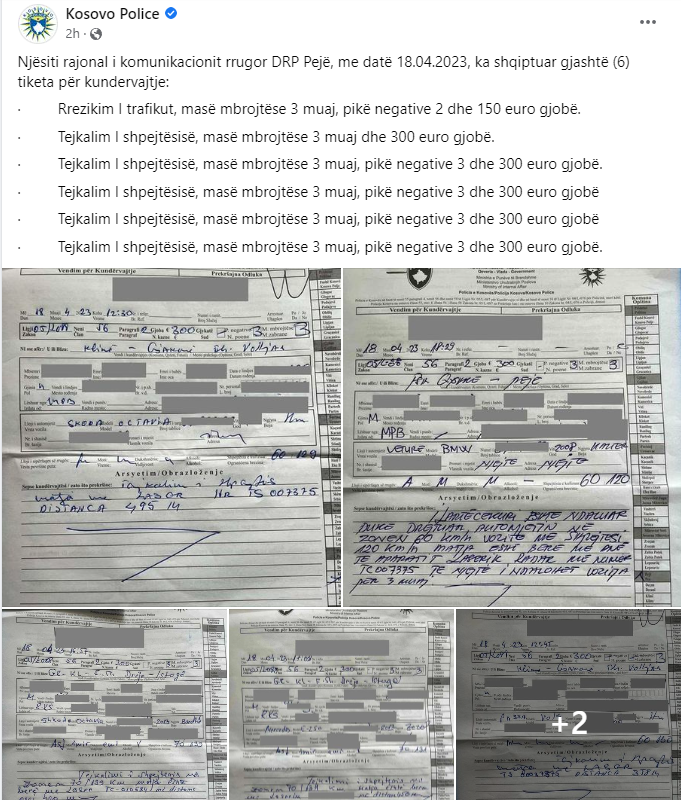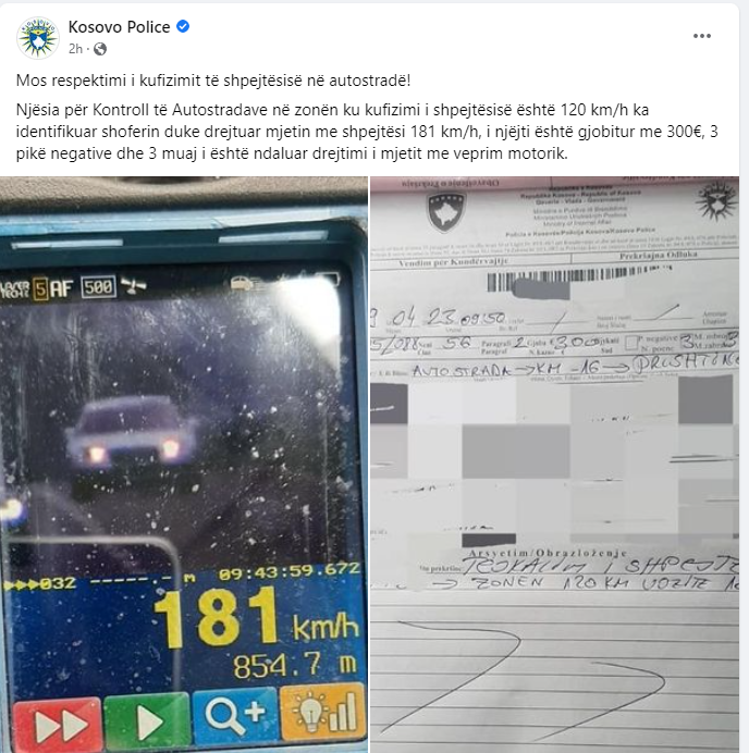 Policia e Kosovës njofton se ka gjobitur një shofer me 300 euro, 3 pikë negative dhe 3 muaj ndalim të drejtimit të mjetit.