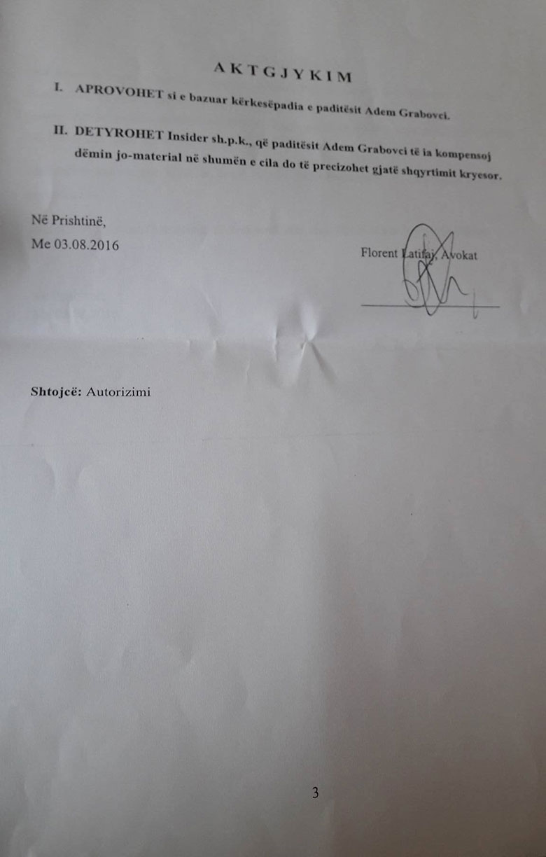 “Ndërsa, pas administrimit të të gjitha provave lidhur me rastin konkret i propozojmë gjyaktës që të sjellë këtë aktvendim: Të aprovohet si e bazuar kërkesëpadia e Adem Grabovcit; të detyrohet Insider sh.p.k që paditësit t’ia kompensojë dëmin jomaterial në shumën e cila do të precizohet gjatë shqyrtimit kryesor”, kërkohet në padi.