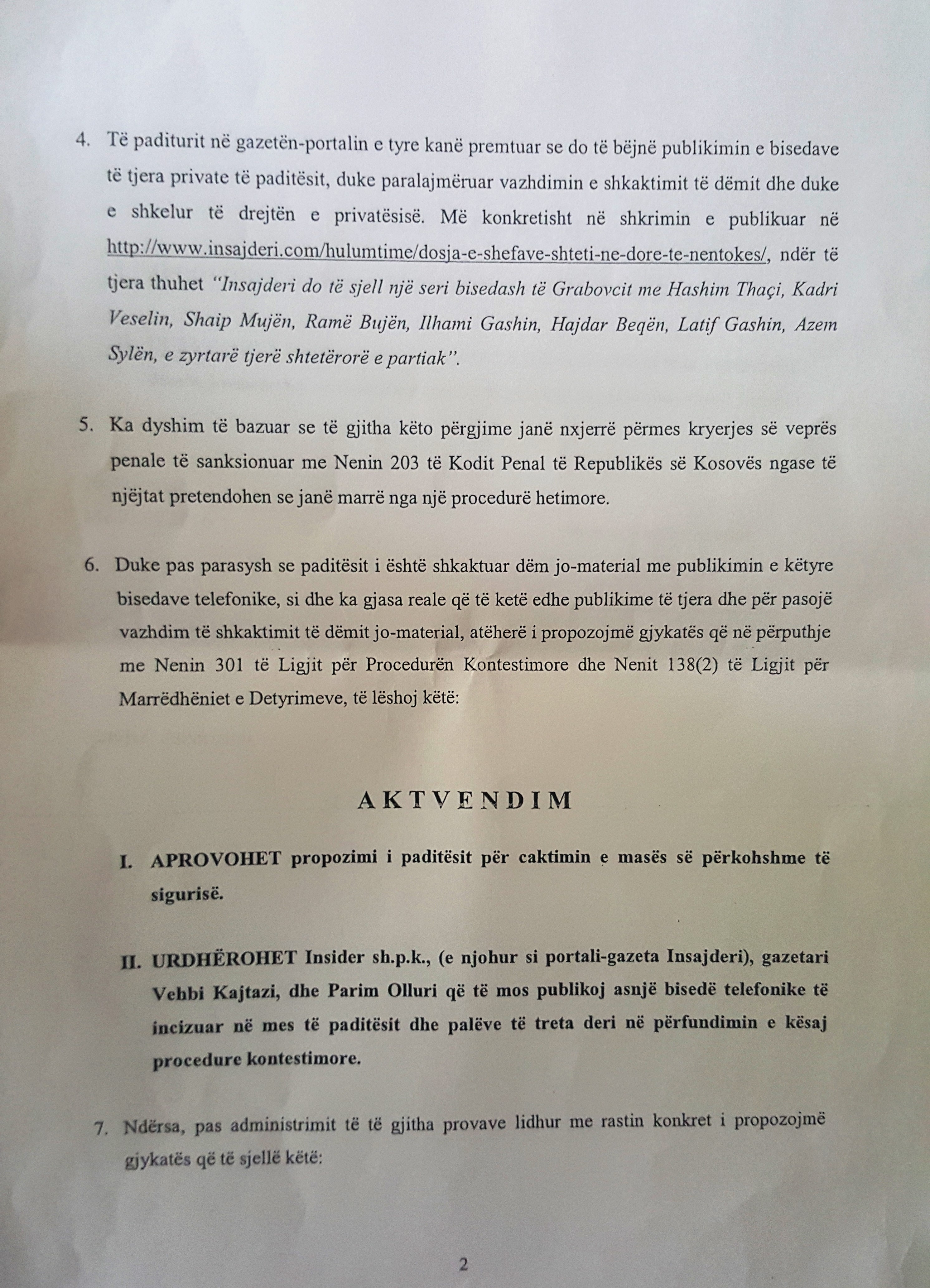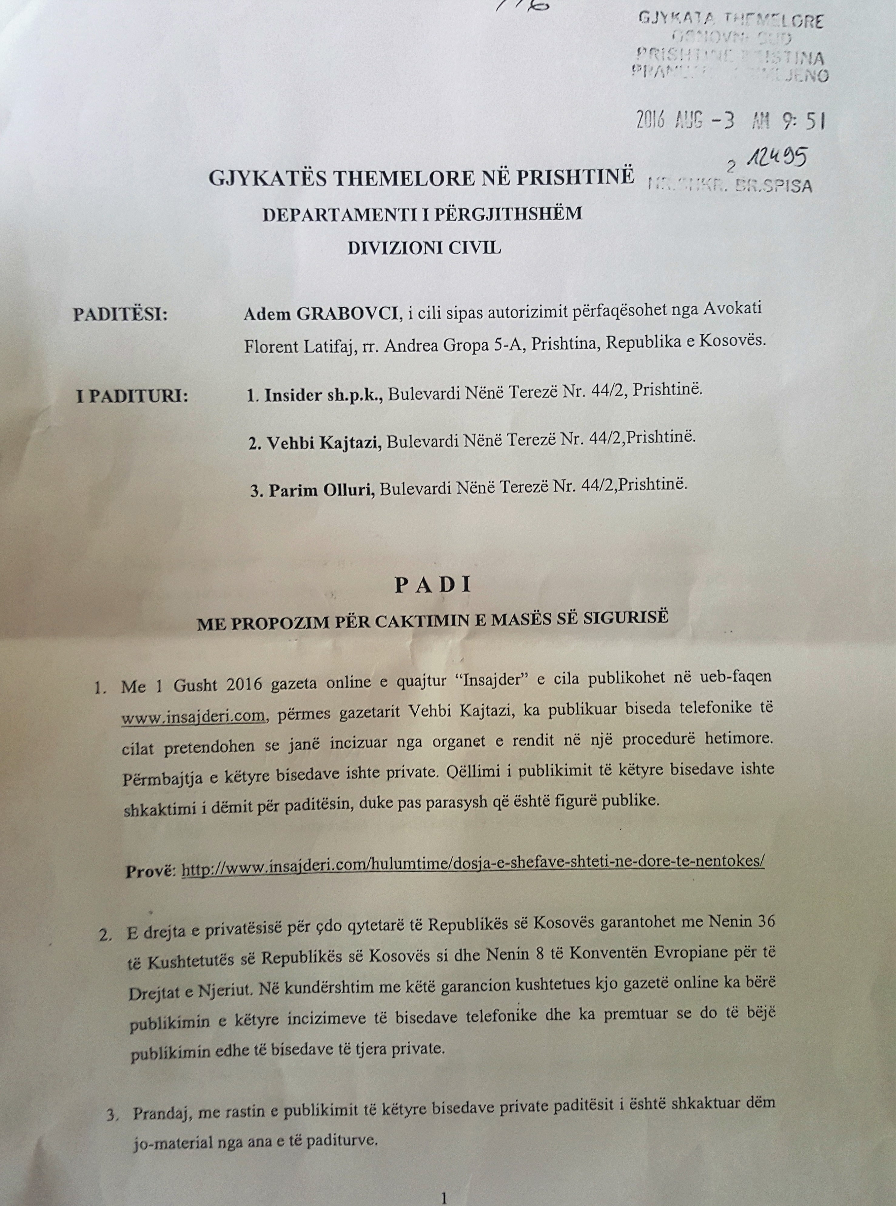 “Me 1 Gusht 2016 gazeta online e quajtur ‘Insajder’ e cila publikohet ne uep-faqen www.insajderi.com, përmes gazetarit Vehbi Kajtazi, ka publikuar biseda telefonike të cilat pretendohen se janë incizuar nga organet e rendit në një procedurë hetimore. Përmbajtja e këtyre bisedave ishte private. Qëllimi i publikimit të këtyre bisedave ishte shkaktimi i dëmit për paditësin, duke pas parasysh që është figurë publike”, thuhet në fillim të padisë.