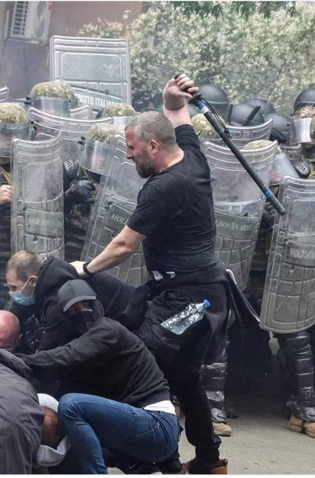 Një fotografi që është shpërndarë në Twitter, shihet teksa Dragani godet me shkop policie ushtarët e NATO-s në Kosovë.