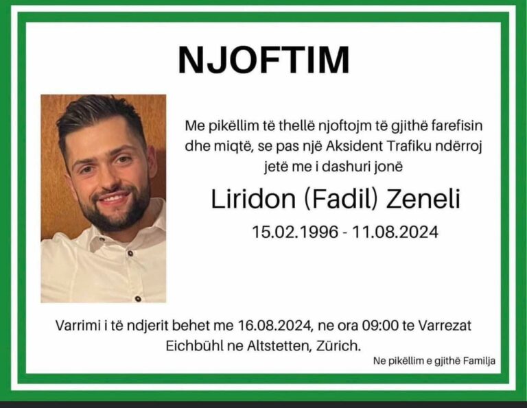 Sipas njoftimit varrimi 29-vjeçarit, Liridon Zeneli, do të bëhet të premten më 16 gusht, në varrezat e Eichbuhl në Altstetten në Zurich.Ceremonia e varrimit do të mbahet nga ora 09:00.