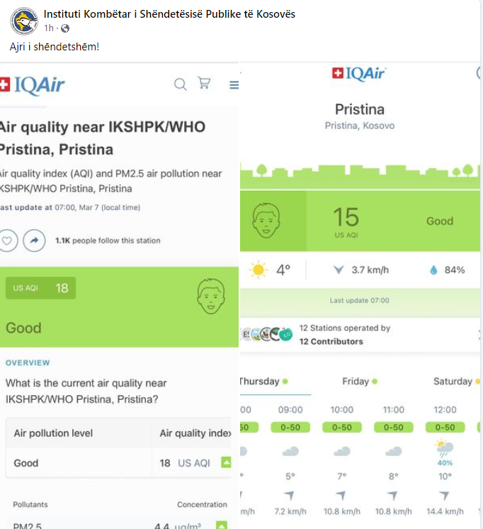 Sipas një foto që ka publikuar ky institut, shihet se indeksi i cilësisë së ajrit është 18.