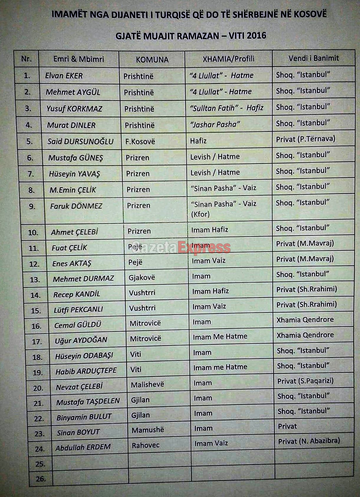 Gazeta Express ka siguruar listën e së paku 24 imamëve që ishin shpërndarë nëpër xhamitë më me ndikimi në Kosovë gjatë ramazanit të fundit.