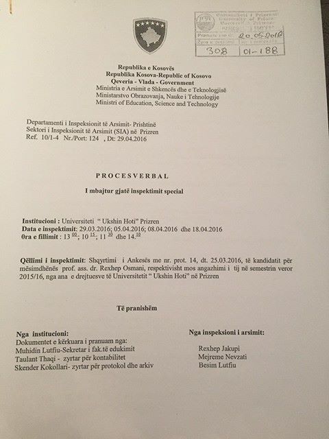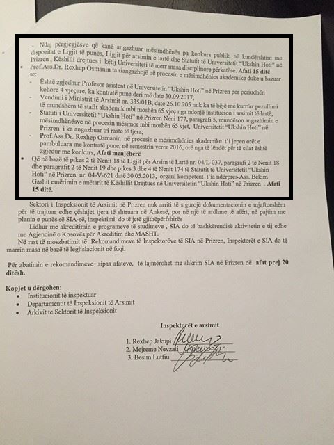 “Prof. Ass. Dr.  Rexhep Osmanin në procesin e mësimdhënies akademike, ti jepen orës e pambuluara me kontratë pune, në semestrin veror 2016…”, thuhet në këtë vendim të Inspektoratit të Arsimit në Prizren.