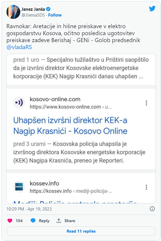 “E fundit: Arrestimet dhe bastisjet e shtëpive në industrinë elektrike të Kosovës, me sa duket rezultat i gjetjeve të hetimit të rastit Berishaj – GENI – presidentit Golob”, shkroi Jansha në rrjetin e tij social “Twitter”.