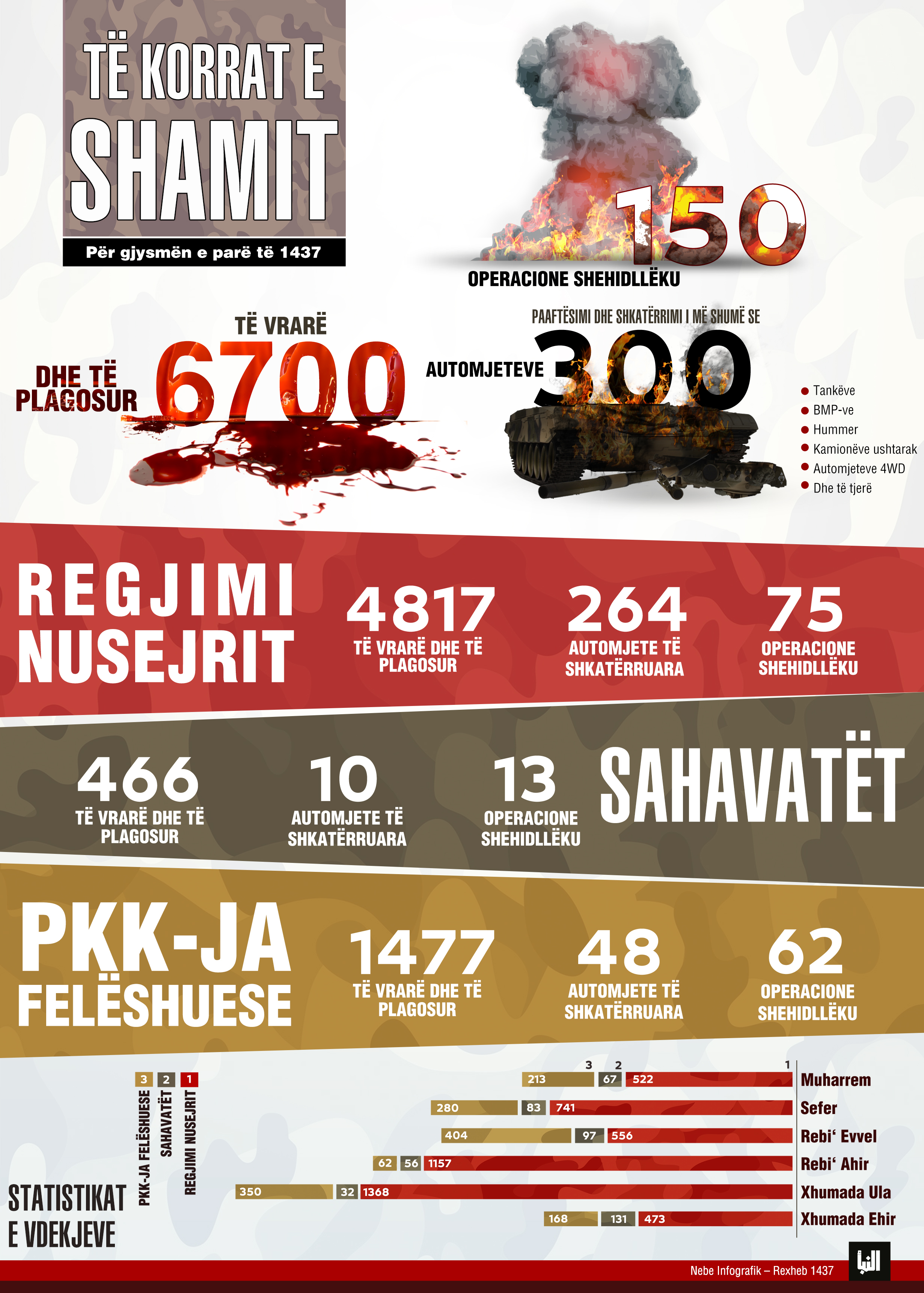 I titulluar “Infografik: Të korrat e Shamit (Për gjysmën e parë të 1437), ka shkruar se ka bërë 150 operacione shehidllëku dhe prej këtyre ka rezultuar me 6 mijë e 700 të vrarë dhe të plagosur.
