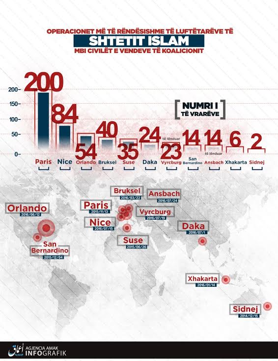 Kurse në vendet tjera si  Nicë kanë vrarë 84 persona, në Orlando 54 persona, 40 në Bruksel, 24 në Daka, 23 në Vyrcburg,  14 në San Bernardino, 6 në Xhakarta dhe 2 në Sidnej.