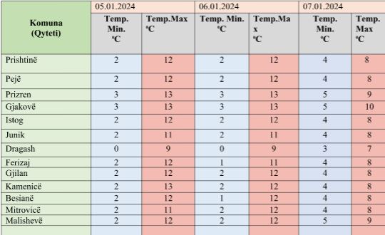 E enjte – Mot kryesisht i ngjashëm, i vranët dhe vende-vende me riga shiu. Temperaturat minimale do të lëvizin ndërmjet 1-3 gradë Celsius, ndërsa maksimalet e ditës parashihen të lëvizin ndërmjet 10-13 gradë Celsius.