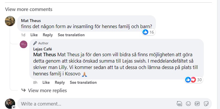 Në një koment në postimin që kanë bërë në Facebook, njoftojnë se të gjithë personat që dëshirojnë të ndihmojnë familjen Ademaj dhe dy fëmijët e saj mund ta bëjnë përmes kafenesë “Lejas”, shkruan Gazeta Insadjeri.