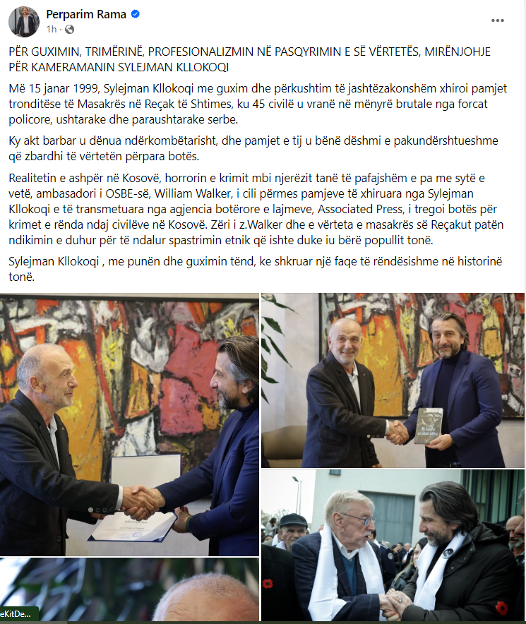 Kameramani që xhiroi masakrën e Reçakut, Sylejman Kllokoqi ka marr sot mirënjohje nga kryetari i Prishtinës, Përparim Rama, shkruan Insajderi.