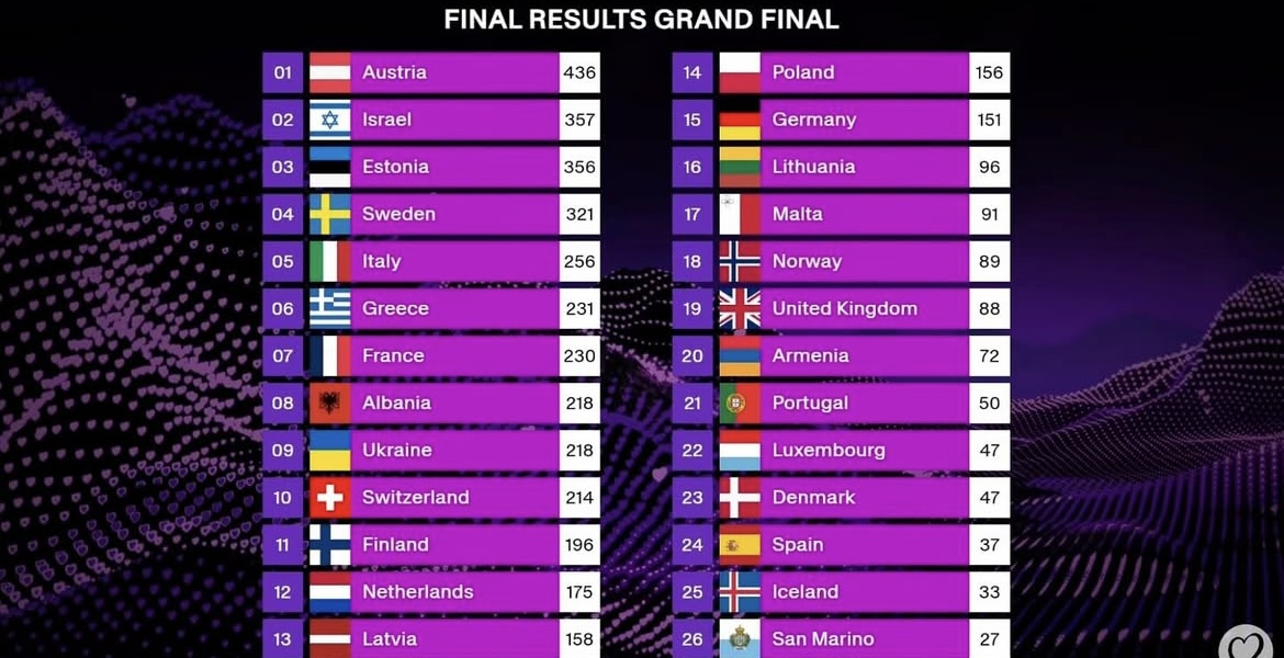 Këto janë rezultatet finale të Eurovisionit