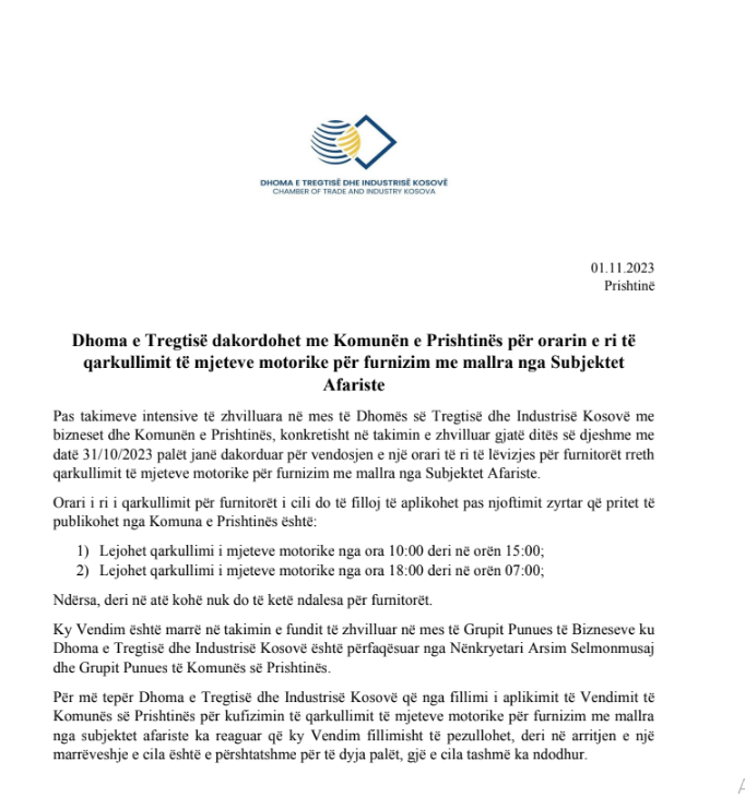 Dhoma e Tregtisë dhe Industrisë ka njoftuar se ka arritur pajtueshmëri me Komunën e Prishtinës për orarin e qarkullimit të furnitorëve në kryeqytet.