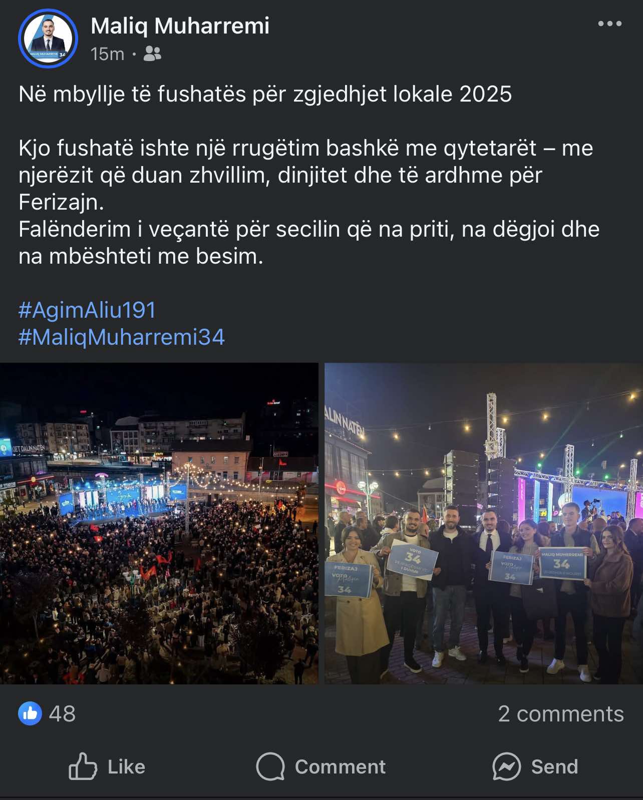 “Në mbyllje të fushatës për zgjedhjet lokale 2025, kjo fushatë ishte një rrugëtim bashkë me qytetarët – me njerëzit që duan zhvillim, dinjitet dhe të ardhme për Ferizajn,” ka deklaruar Muharremi.