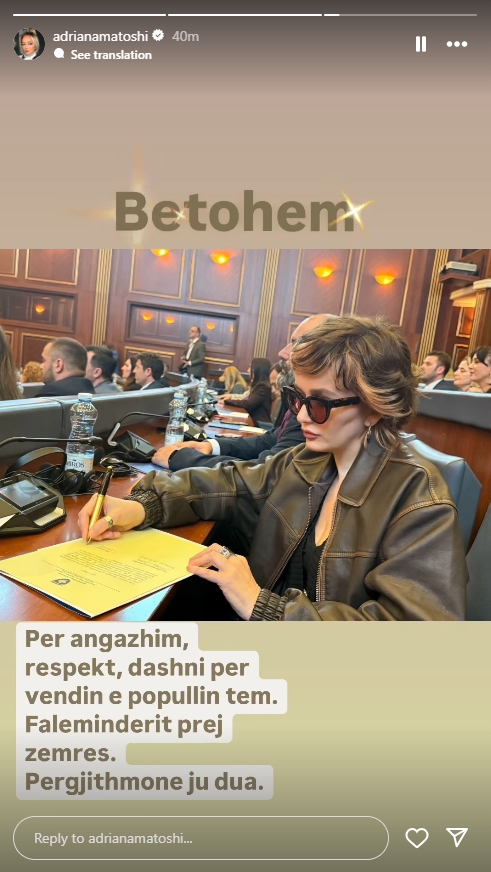 Aktorja dhe deputetja e Lëvizjes Vetëvendosje, Adriana Matoshi, është betuar sot për mandatin e saj të dytë në Kuvendin e Kosovës. Ajo ndau një moment simbolik në InstaStory nga nënshkrimi i dekretit, duke falënderuar qytetarët për besimin, shkruan Insajderi.