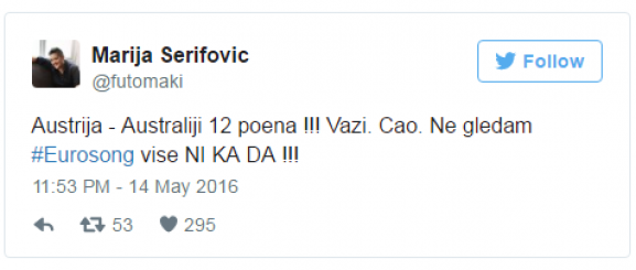 Marija Serifovic, fituesja e Eurovizionit, serbja që këndoi “Molitva” në vitin 2007, ka shkruar në Twitter se me këtë sistem nuk do ta shikojë më Eurovizionin. Ajo ka përmendur 12-të pikët e Austrisë për Australinë, diçka që sipas saj tregon mbi politikat e festivalit.