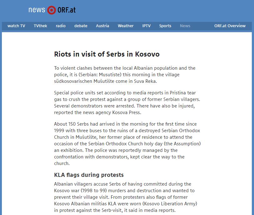 Mediumi i njohur austriak, ORF i vë theks të veçantë protestës së organizuar nga qytetarët e Mushtishtit, dhe shkruan se gjatë kësaj proteste kishte edhe “flamuj të UCK-së”.