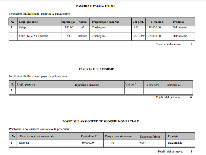 Ndërsa para të gatshme ai mbanë në dy banka: në BpB (805 euro) dhe në proCreditBank (51,821.00 euro), njofton Agjencia Kundër Korrupsion.