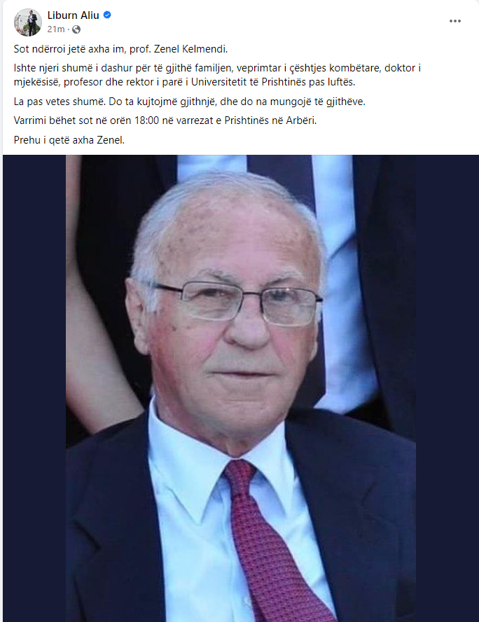 Liburn Aliu, Ministër i Mjedisit, Planifikimit Hapësinor dhe Infrastrukturës, njofton për vdekjen e axhës së tij prof.Zenel Kelmendi.
