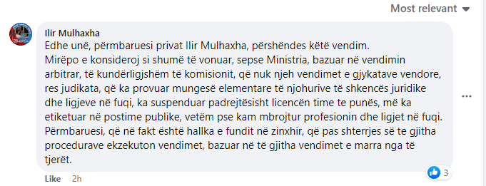 “Mirëpo e konsideroj si shumë të vonuar, sepse Ministria, bazuar në vendimin arbitrar, të kundërligjshëm të komisionit, që nuk njeh vendimet e gjykatave vendore, res judikata, që ka provuar mungesë elementare të njohurive të shkencës juridike dhe ligjeve në fuqi, ka suspenduar padrejtësisht licencën time te punës, më ka etiketuar në postime publike, vetëm pse kam mbrojtur profesionin dhe ligjet në fuqi. Përmbaruesi, që në fakt është hallka e fundit në zinxhir, që pas shterrjes së te gjitha procedurave ekzekuton vendimet, bazuar në të gjitha vendimet e marra nga të tjerët”, ka shkruar ai në një koment në facebook.