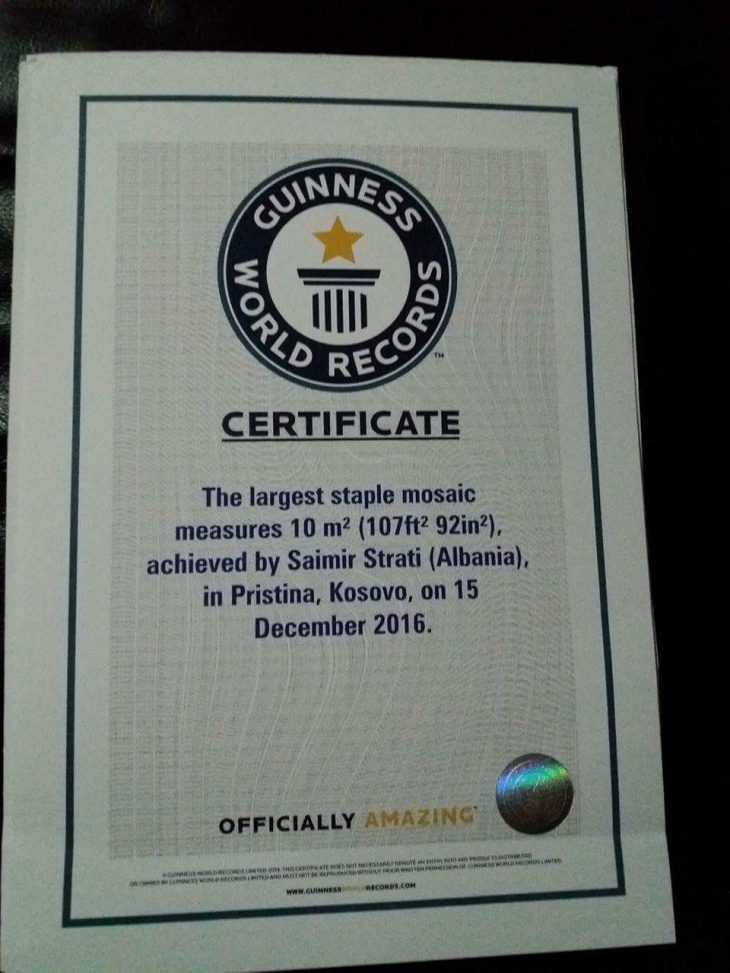 Mozaiku më i ri i muzeut Kombëtar të Kosovës me portretin e Nënë Terezës, vepër e artistit nga Shqipëria, Saimir Strati, ka hyrë zyrtarisht në librin e rekordeve botërore “Guinness”.
