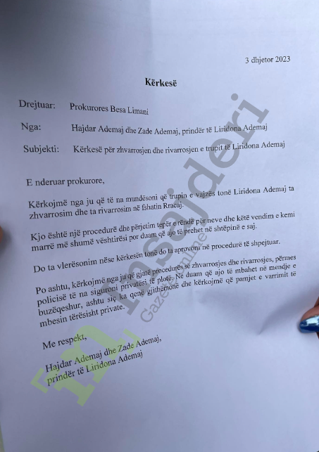 “Kërkojmë nga ju që të na mundësoni që trupin e vajzës tonë Liridona Ademja ta zhvarrosim dhe ta rivarrosim në fshatin Rracaj. Do ta vlerësonim nëse kërkesën tonë do ta aprovoni në procedurë të shpejtuar”.