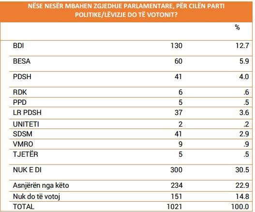 Nga rezultatet në anketës del se BDI-ja në këto zgjedhje mund të jetë fituese absolute e tyre. Por ka edhe nga ata që nuk janë përcaktuar fare se cilës parti do t’ia jap votën.