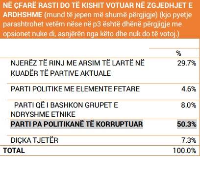“Gjysma e të anketuarve ose 50.3% do të votonin për parti pa politikanë të korruptuar, ndërsa pak më shumë se një e katërta e tyre (29.7%) do të votonin për persona të rinj me arsimim të lartë në kuadër të partive ekzistuese”, thuhet në këtë komunikatë.