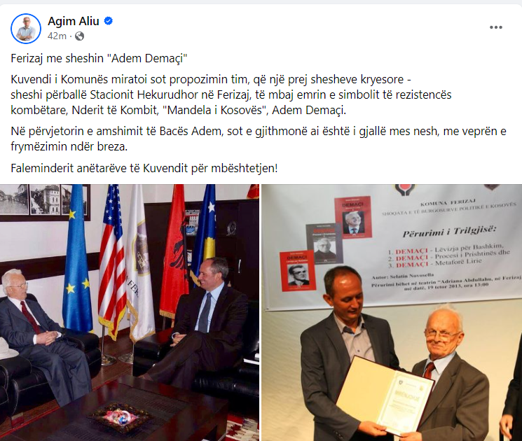 Kryetari i Komunës së Ferizajt, Agim Aliu ka njoftuar se një shesh në këtë komunë do të emërohet me emrin e “Adem Demaçit”