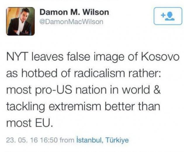 Zëvendësshefi i “Atlantic Council”, njëra prej organizatave më prestigjioze botërore në fushën e sigurisë, Damon M. Wilson, ka shkruar sot në rrjetin social Twitter se New York Times ka botuar një imazh të rremë të Kosovës si gjoja vatër të radikalizmit.