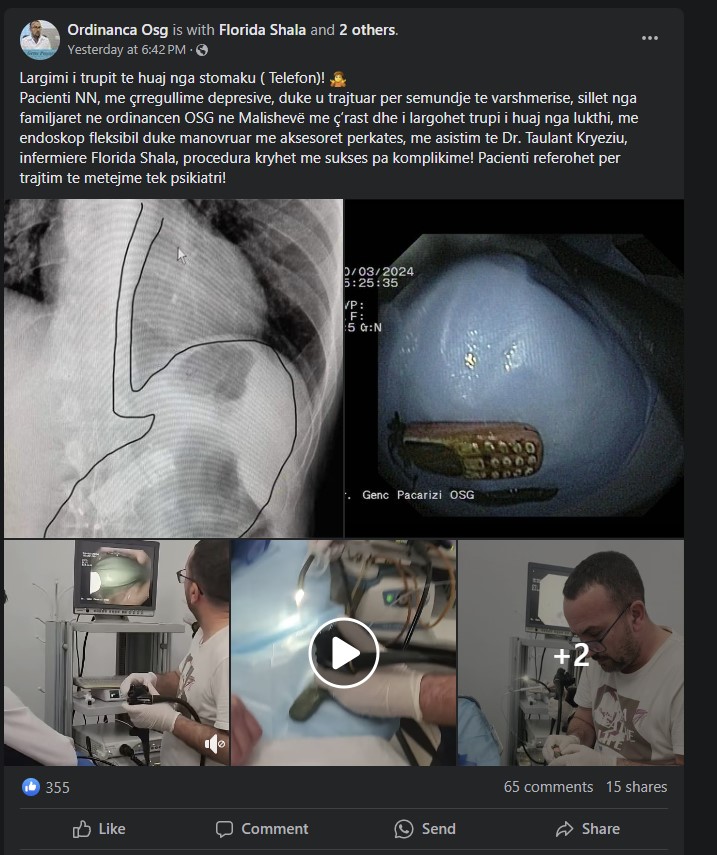 “Pacienti NN, me çrregullime depresive, duke u trajtuar per semundje te varshmerise, sillet nga familjaret ne ordinancen OSG ne Malishevë me ç’rast dhe i largohet trupi i huaj nga lukthi, me endoskop fleksibil duke manovruar me aksesoret perkates, me asistim te Dr. Taulant Kryeziu, infermiere Florida Shala, procedura kryhet me sukses pa komplikime! Pacienti referohet per trajtim te metejme tek psikiatri”, thuhet në postimin e Ordinancës OSG.