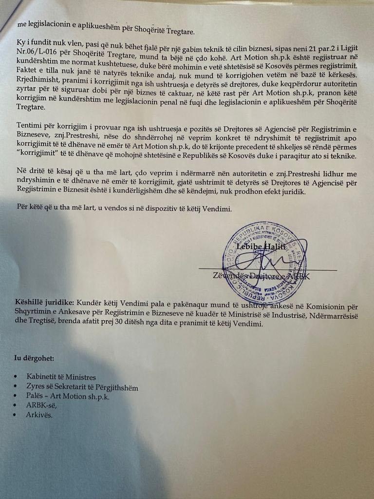 Zëvendës Drejtorja e ARBK-së, Lebibe Haliti, ka marrë vendim të shfuqizoj çertifikatën e biznesit të Komanisë “Art Motion”.
