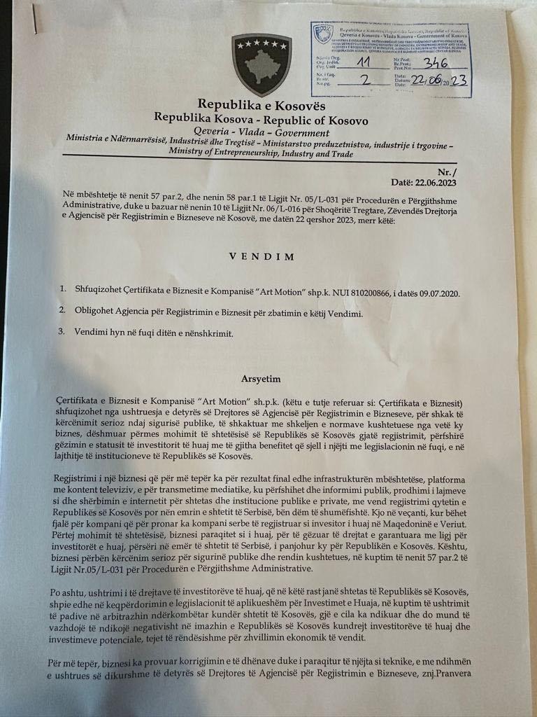 Ditë më parë, iu shfuqizua çertifikata Klan Kosovës. Ndërsa sipas këtij vendimi, që mban datën 22 qershor (dje), tashmë çertifikata iu është shfuqizuar edhe Kompanisë “Art Motion”.